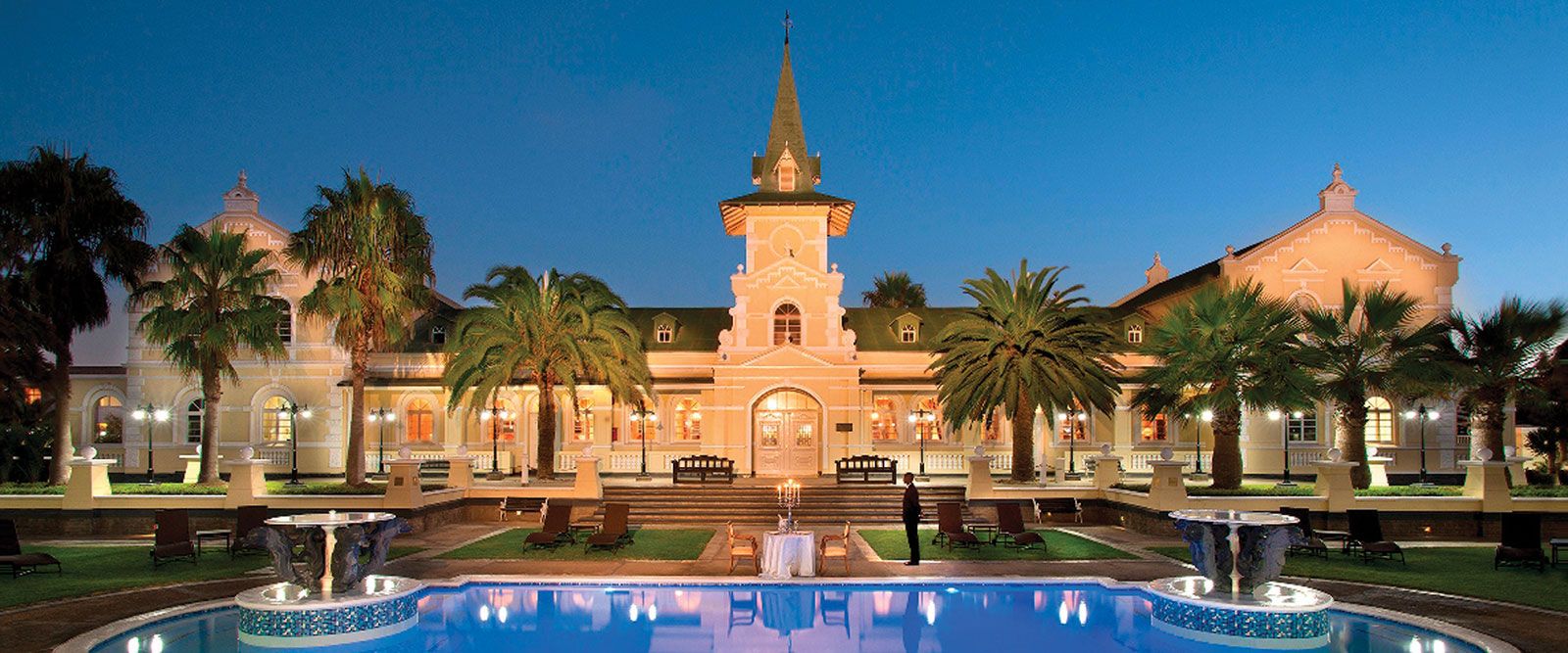 The Swakopmund Hotel and Entertainment Centre is situated in the beautiful town of Swakopmund and combines history and modern luxury. The hotel is built in and around the old German station building and the spacious and luxurious rooms offer an elegant Victorian style.