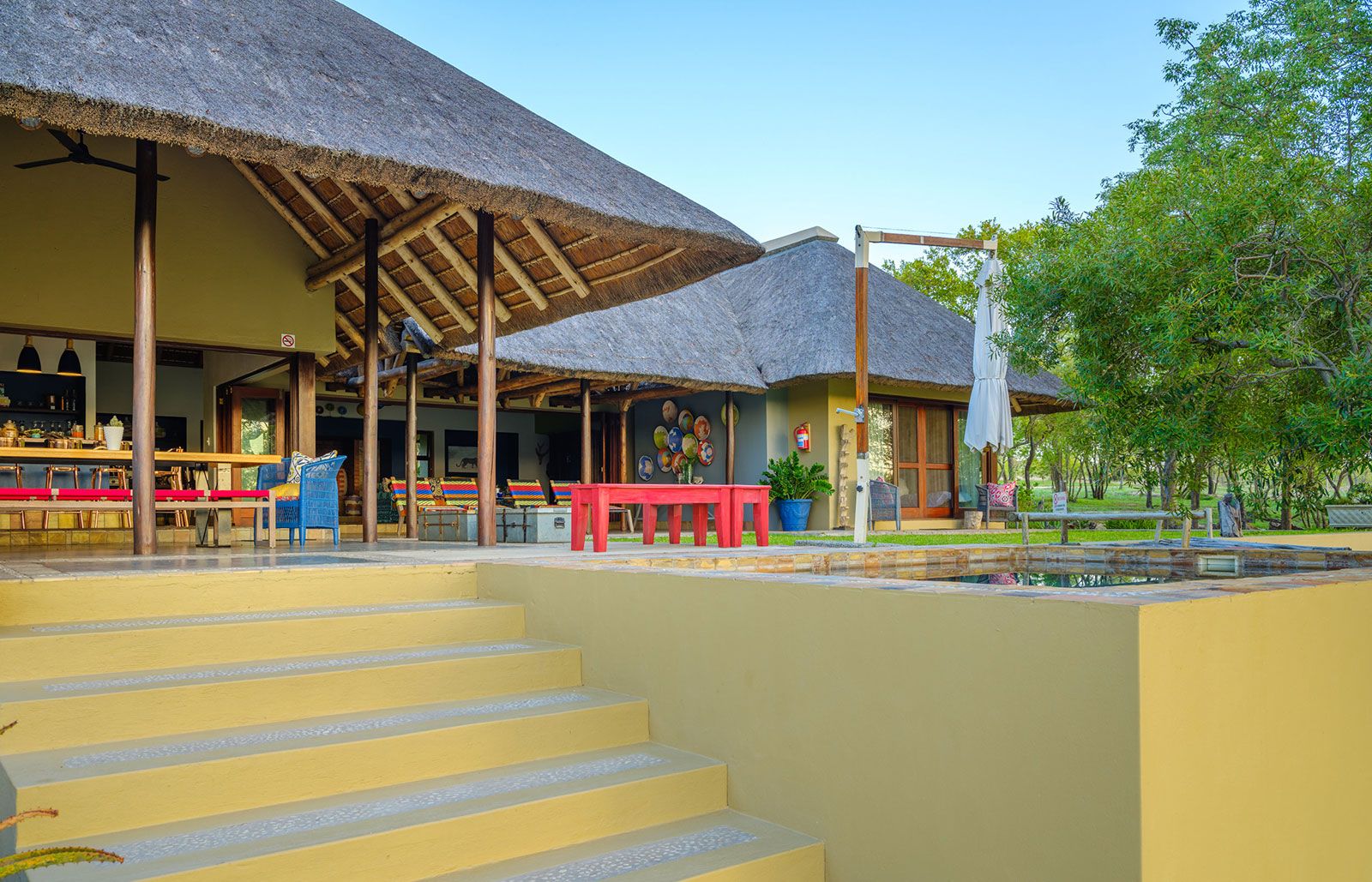 Sabi House belongs to a reputable portfolio of lodges and properties in South Africa, making it a product of excellence in hospitality. It is idyllically located and the layout is well thought out. The main lodge with indoor and outdoor dining rooms, bar, pool, and lounge areas is the centre of entertainment, while the bedrooms are located in the nearby guest cottage, keeping them private and tranquil. Sabi House accommodation is thatched and simply designed, but it really comes to life in its unique, bold decor. Bringing colours and patterns into the furniture, light fittings, and wall art turn this exclusive villa into a fun and vibrant bush home.