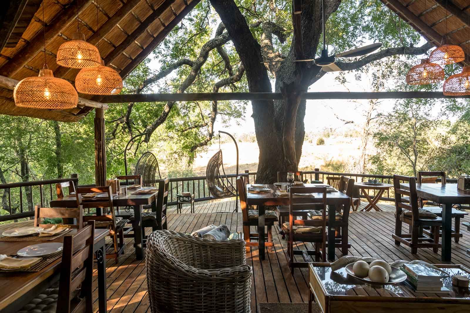 10 canvas tented suites built on individual raised wooden platforms rest under a canopy of trees just a stone’s throw away from the seasonal Sand River. One of the suites is ideal for honeymooners and has an outdoor shower and plunge pool, and deep set bath. The main lodge is quite the talking point. It’s built on a wooden treehouse deck overlooking the wilderness, with the breakfast area elegantly constructed around a weeping boer-bean tree.