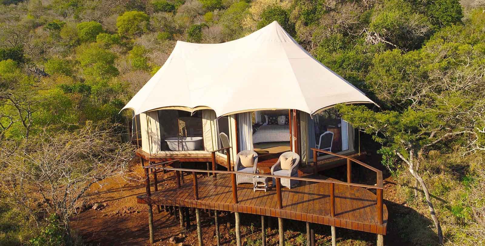 With fifteen deluxe safari tents and the extra-opulent Jabula safari tent, Thanda Tented Camp offers a classic safari experience for honeymooners, special events, or families. This safari camp features a central living space for lounging and dining, a pool, and a boma where guests may gather around a fire at night. Lanterns illuminate the walkways leading to the safari tents at night, creating an atmospheric forest setting. The safari experience at Thanda Tented Camp is just as nostalgic. This is bush life the way it was intended by nature: friendly and open, with unparalleled access to the forest and all of its sights, sounds, and smells. Each tent has its own sun patio and a private bathroom made of canvas. The centre area features a rim-flow pool and an atmospheric lounge and dining area in the Hemingway fashion featuring African artworks.