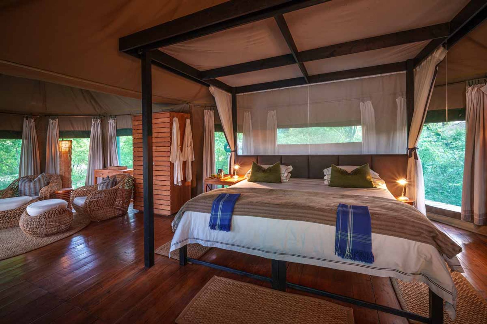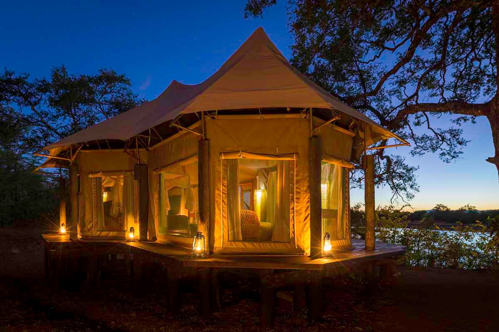 - Each of the very spacious tents is constructed of white canvas on a raised wooden platform overlooking the lagoon, with open verandahs.